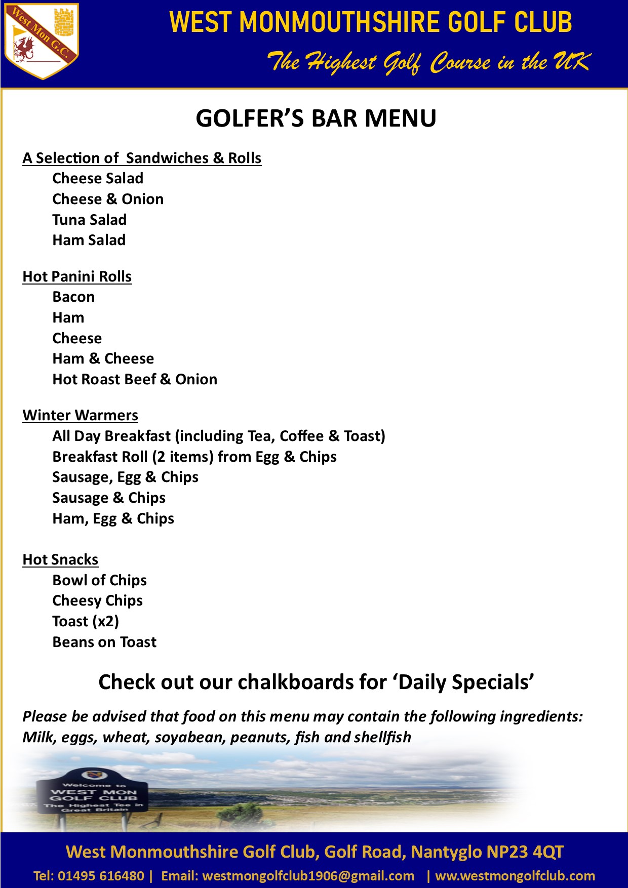 Golfers bar menu 01032024 No Prices